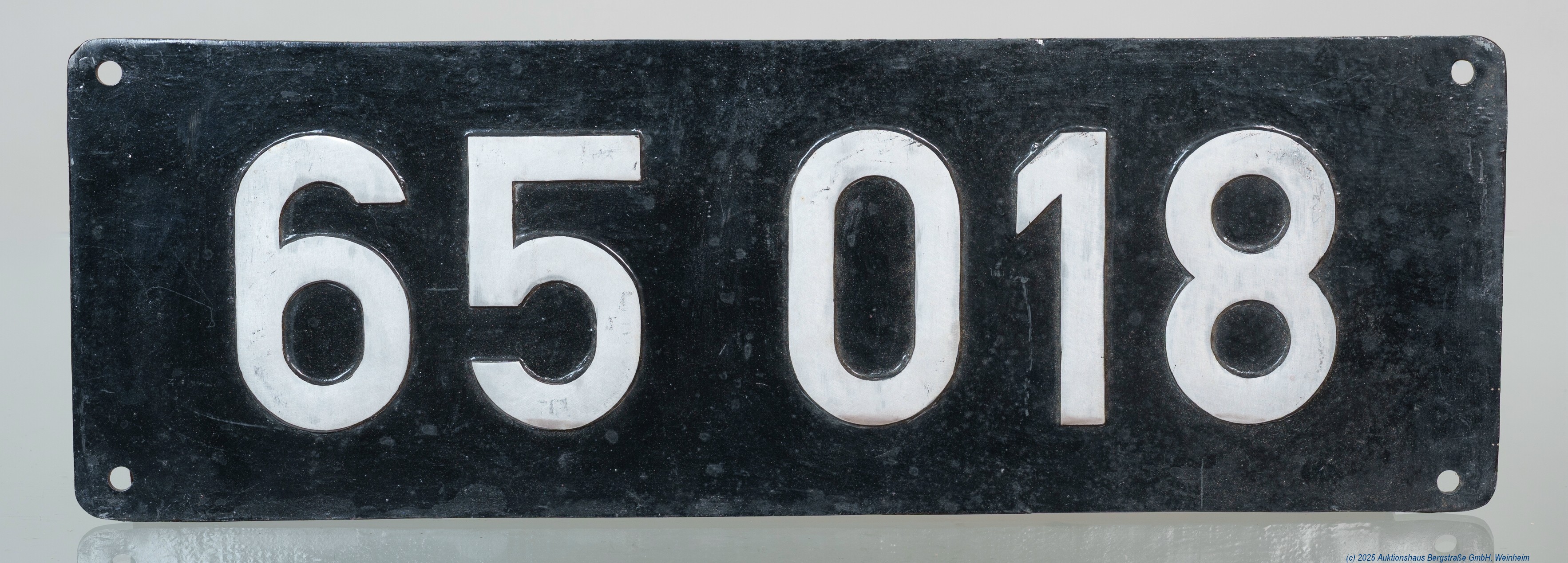 6022 | Tax: 40,- | 1 Lokomotivnummernschild: '65.018' Typographie DB, Epoche III, Aluminium-Guss, möglicherweise Original, überlackiert, 60 cm x 20 cm, leichte Gebrauchsspuren, noch guter Zustand, bitte besichtigen! | |