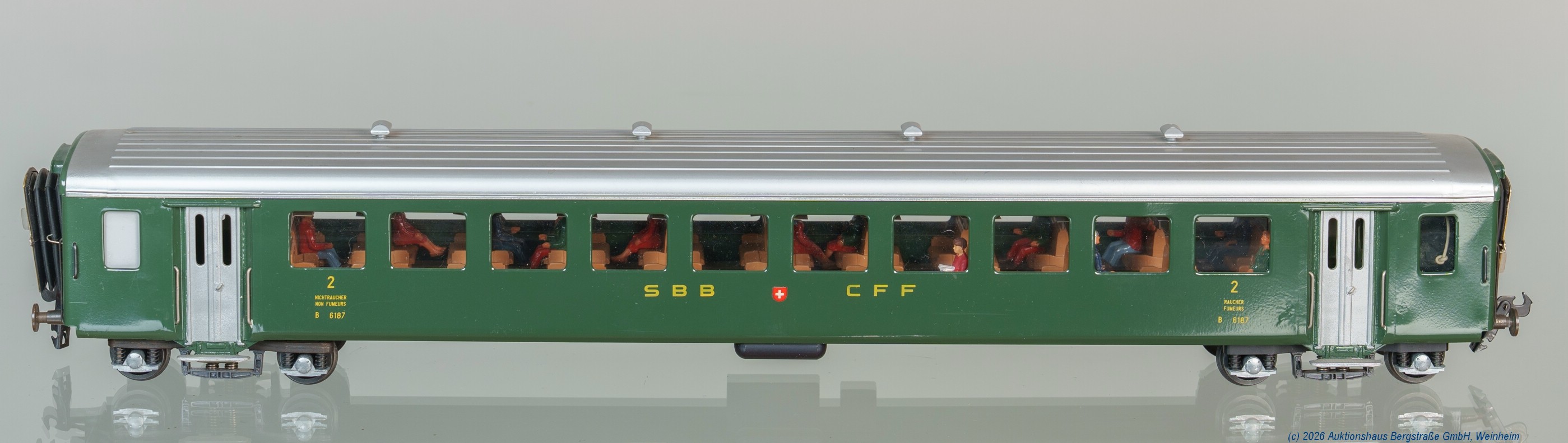 | 3001 | Tax: 140,- | 1 Hermann Spur 0 Leichtschnellzugwagen, 4-achs., SBB, Epoche III, 2.Klasse, Wagennummer: B 6187, Länge: ca. 52,5 cm, dunkelgrün, Türen und Dach: silberfarben, vier Dachlüfter, Federpuffer, bewegliche Faltenbalgübergänge, mit Reisenden versehen, sehr guter Zustand! | |