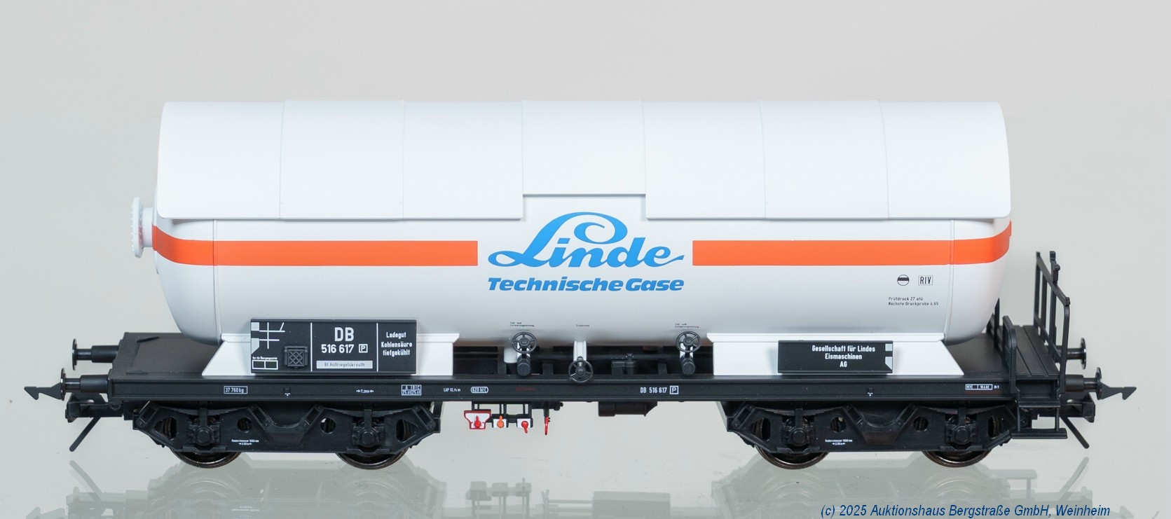 | 3002 | Tax: 70,- | 1 MBW Druckgaskesselwagen 80516, 4-achs., Deutsche Bundesbahn, Epoche III, Wagennummer: 516.617, Kessel: weiß, Aufschrift: 'Linde - Technische Gase', Rahmen: schwarz, absolut neuwertig, Originalkarton! | |