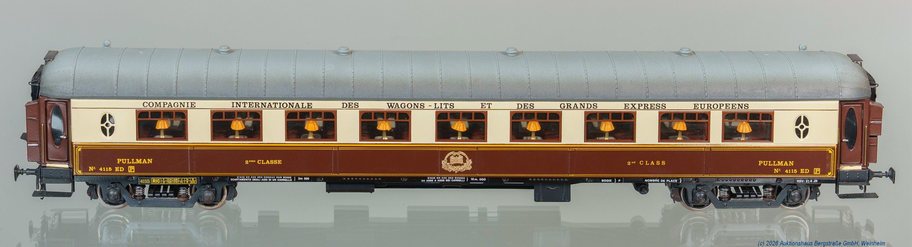 | 3003 | Tax: 180,- | 1 Elletren/Fulgurex Spur 0 Pullmanwagen, 4-achs., CIWL, Epoche II/III, Wagennummer: 4115 ED, Länge: ca. 55 cm, braun/cremefarben, Dach: grau, Inneneinrichtung, Federpuffer, Vorbildkupplungen, Metallradsätze, hochfeine Metallausführung, sehr guter Zustand! | |
