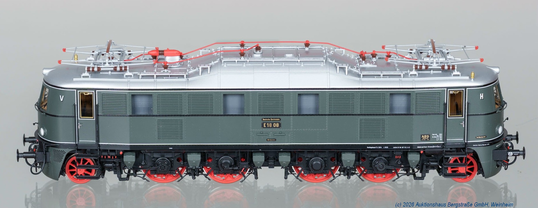 | 3005 | Tax: 950,- | 1 Kiss Spur 0 Schnellzug-Elektrolokomotive 410005, Baureihe: E 18, Deutsche Reichsbahn Gesellschaft, Epoche II, Betriebsnummer: E 18.08, Achsfolge: 1'D'1, blaugrau, Dach: silberfarben, Metallausführung, neuwertig, Originalkarton, nur für Selbstabholer! | |