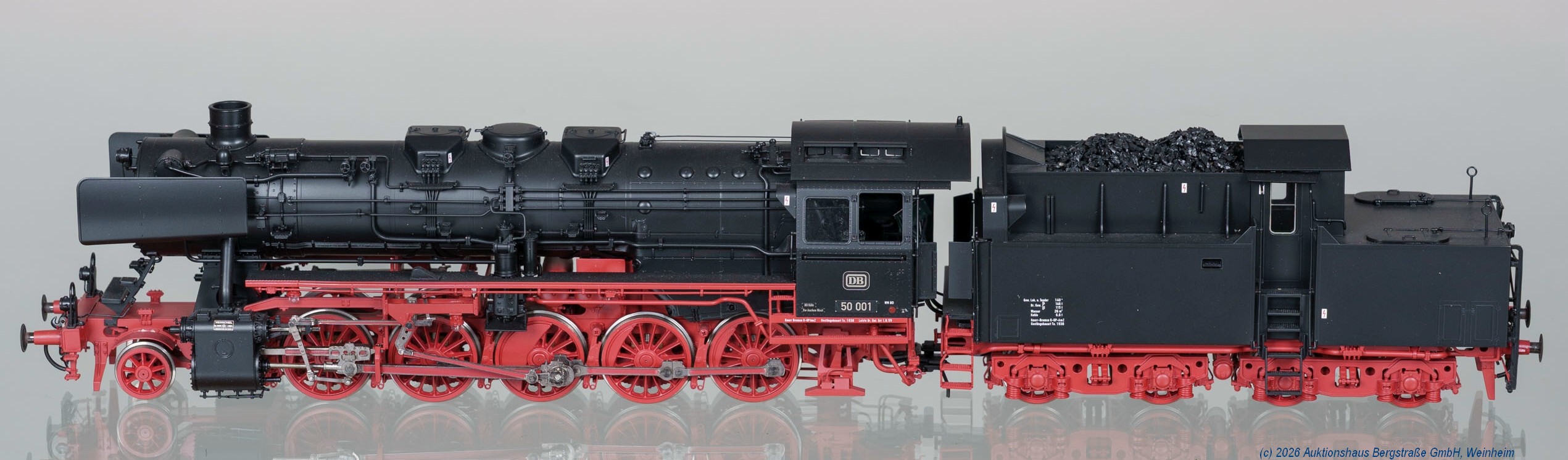 | 3007 | Tax: 720,- | 1 Kiss Dampflokomotive mit 4-achs. Kabinentender 118107, Baureihe: 50, Deutsche Bundesbahn, Epoche III, Betriebsnummer: 50.001, Achsfolge: 1'E', schwarz/rot, 3-Licht Spitzensignal, Witte-Windleitbleche, Ausführung ohne 'Schürze', sehr guter Zustand, Originalkarton, nur an Selbstabholer! | |
