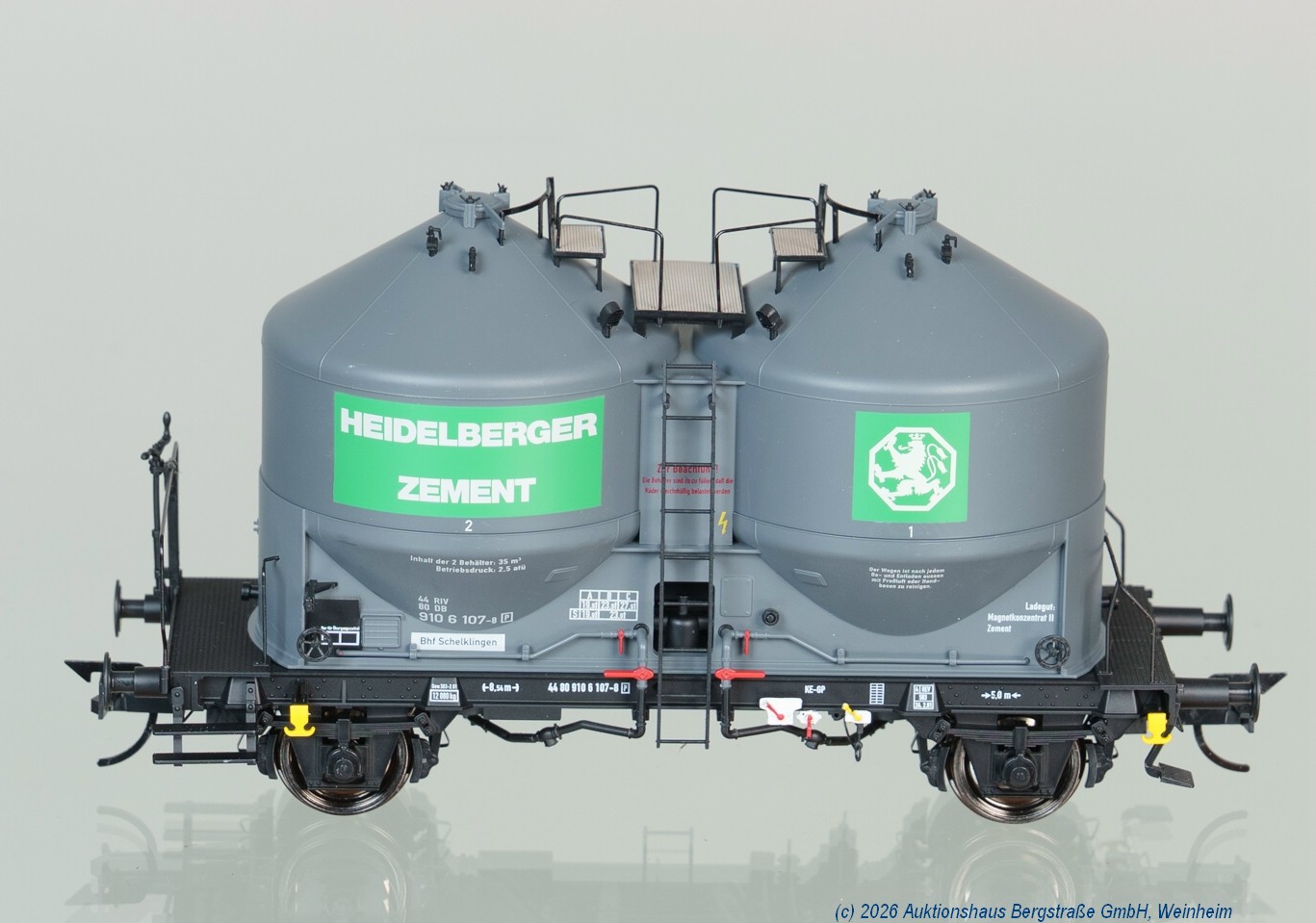 | 3028 | Tax: 54,- | 1 Brawa Spur 0 Staubbehälterwagen mit Bremserbühne 37106, 2-achs., Deutsche Bundesbahn, Epoche IV, Wagennummer: 44.80.910.6.107-8, Bauart: Ucs909, dunkelgrau, Aufschrift: 'Heidelberger Zement', automatische Kupplung, Federpuffer, neuwertiger Zustand, Originalkarton! | |