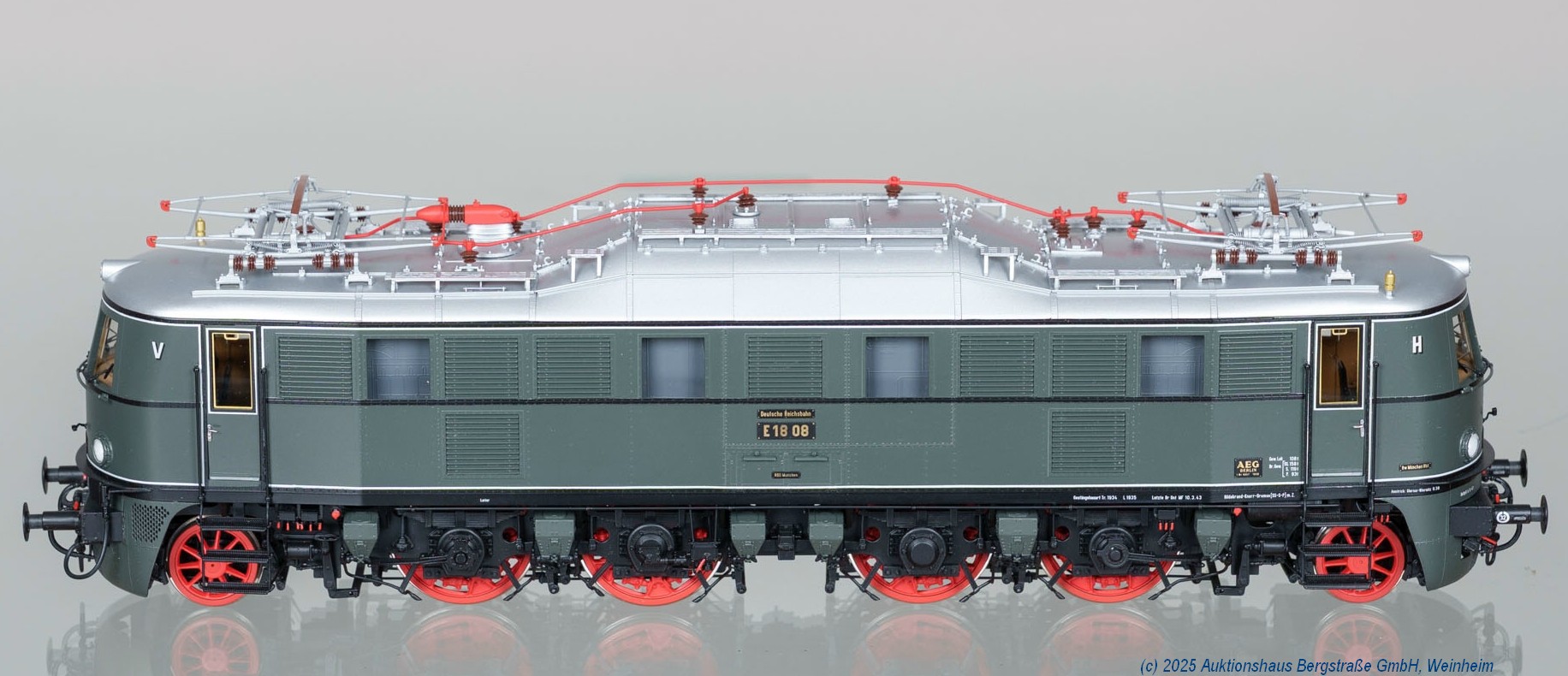 | 3045 | Tax: 1200,- | 1 Kiss Spur 0 Schnellzug-Elektrolokomotive 410005, Baureihe: E 18, Deutsche Reichsbahn Gesellschaft, Epoche II, Betriebsnummer: E 18.08, Achsfolge: 1'D'1, blaugrau, Dach: silberfarben, Metallausführung, neuwertig, Originalkarton, nur für Selbstabholer! | |