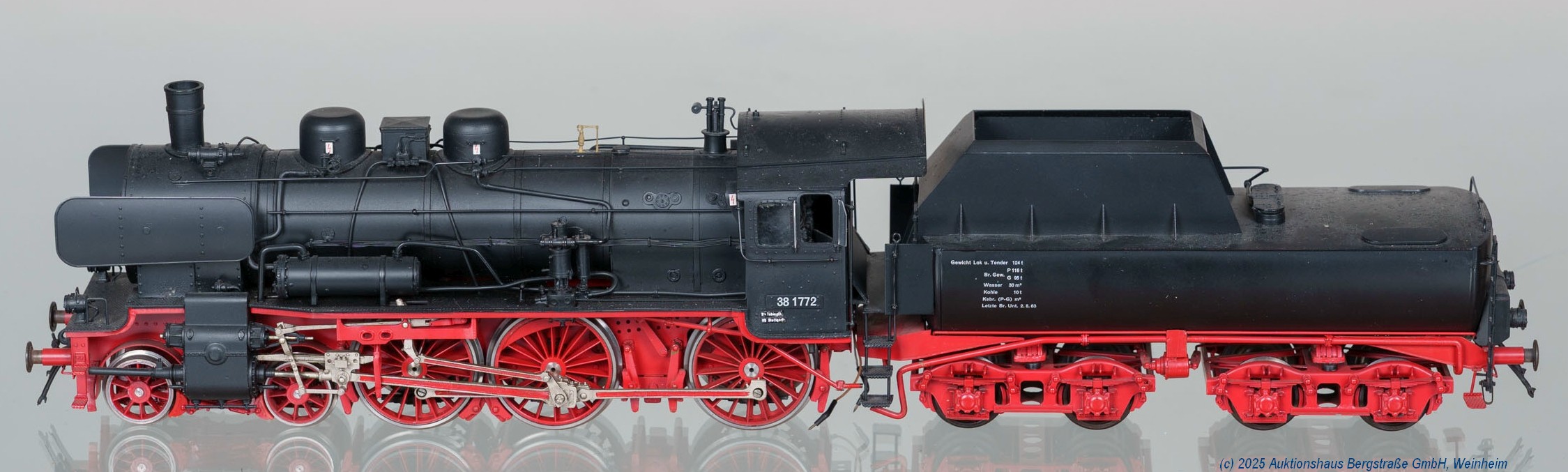 | 3046 | Tax: 850,- | 1 Spring AG Wettingen Spur 0(?): Personenzugdampflokomotive mit Wannentender, Baureihe: 38, Deutsche Bundesbahn, Epoche III, Betriebsnummer: 28.1772, Achsfolge: 2'C', Länge: ca. 47,5 cm, schwarz/rot, schwere Kleinserien-Metallausführung, 2-Licht Spitzensignal, Vorbildkupplungen, Federpuffer, Echtkohlenfüllung für Tender liegt im Beutel bei, sehr guter Zustand, fachgerecht in Holzkoffer verpackt, nur für Selbstabholer! | |
