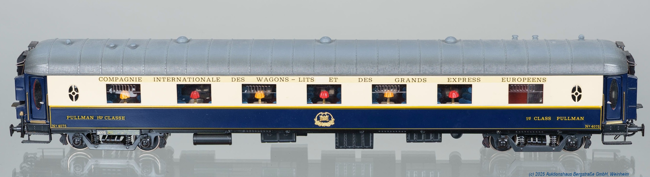 | 3049 | Tax: 230,- | 1 Elletren/Fulgurex Spur 0 Pullmanwagen, 4-achs., CIWL, Epoche II/III, 1.Klasse, Wagennummer: 4075, Länge: ca. 55 cm, dunkelblau/cremefarben, Dach: grau, Inneneinrichtung, Federpuffer, Vorbildkupplungen, Metallradsätze, hochfeine Metallausführung, sehr guter Zustand! | |