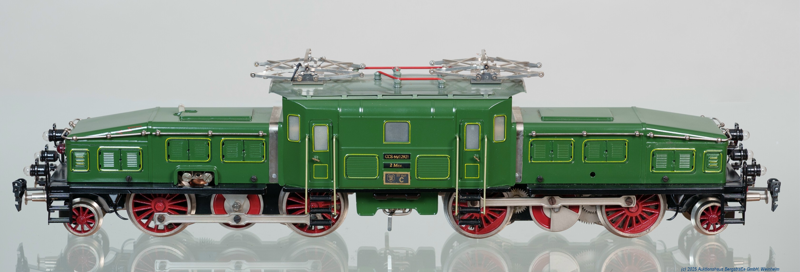 | 7000 | Tax: 2700,- | 1 Thul Spur I Märklin Replika 'Krokodil' CCS 66/12921, Länge: ca. 63 cm, 20 Volt Ausführung, 2-motorig, je drei Spitzenlichter und 1 rotes Schlusslicht an den Fronten, dunkelgrün, Dach: Dach: grau, zwei bewegliche Pantographen, 2 bewegliche Angeltüren auf jeder Seite des Führerstandes, Federpuffer, neuwertiger Zustand, massive Holzkiste, nur an Selbstabholer! | |