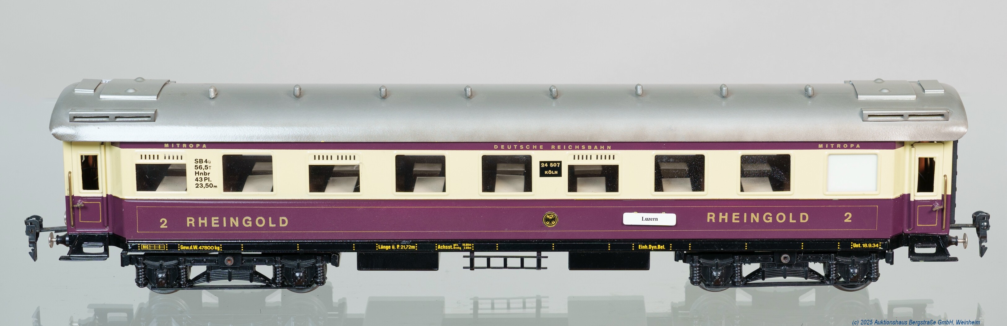 | 7004 | Tax: 170,- | 1 Wilag/Märklin Spur I 'RHEINGOLD'-Salonwagen, 4-achs., vier Angeltüren zum Öffnen, Tonnendach mit 8 imit. Dachlüftern, Länge: ca. 57 cm, Gehäuse: Violett/creme, Aufschrift: 'RHEINGOLD' 'Deutsche Reichsbahn', Dach: silberfarben, seitlich schattiert, Inneneinrichtung, Innenbeleuchtung, Federpuffer, massive Speichenräder, Rahmenbeschriftung, sehr guter Zustand, nur an Selbstabholer! | |