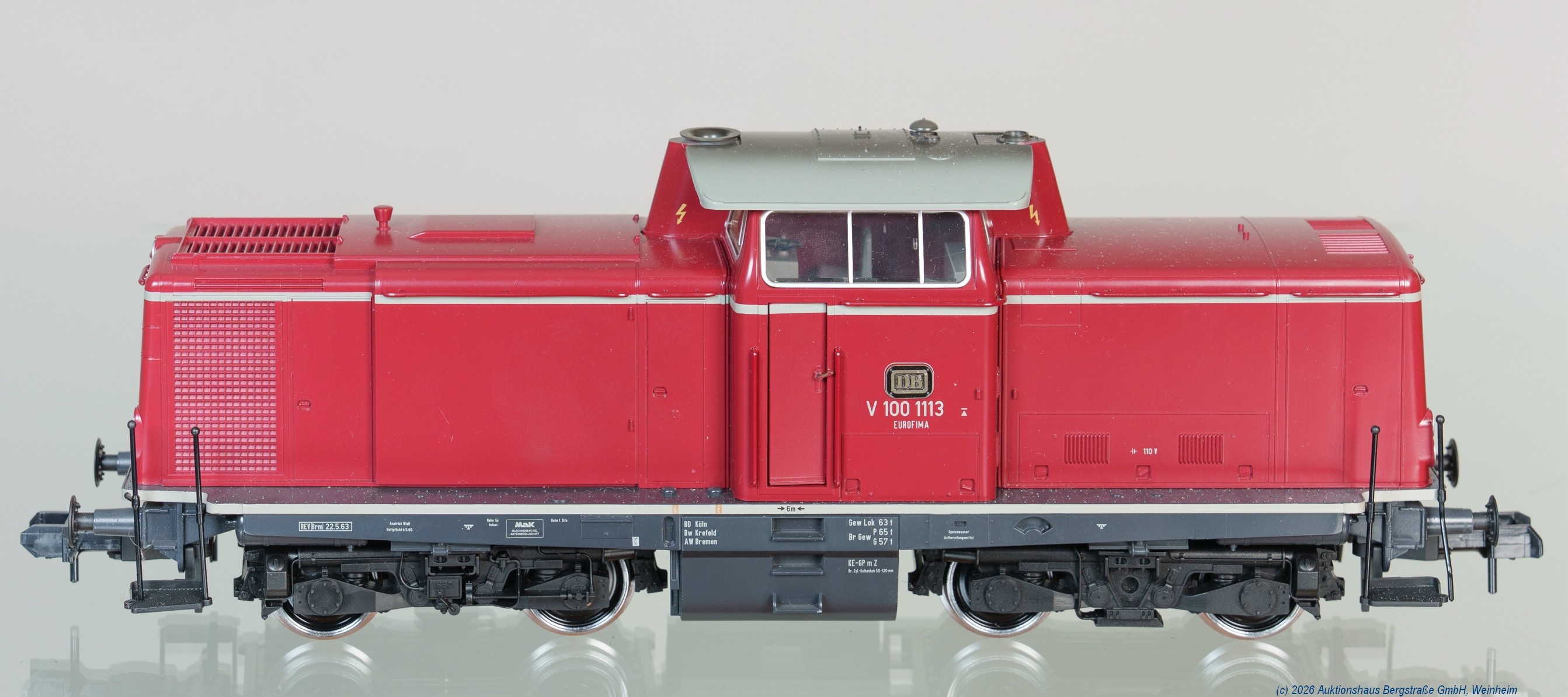 | 4012 | Tax: 240,- | 1 Märklin Spur 1 Diesellokomotive Baureihe: V 100, aus Zugpackung 55721 'Brennstofftransport', Deutsche Bundesbahn, Epoche III, Betriebsnummer: V 100.1113, Achsfolge: 'Bo''Bo', dunkelrot, sehr guter Zustand, massiver Transportkoffer, nur an Selbstabholer! | |