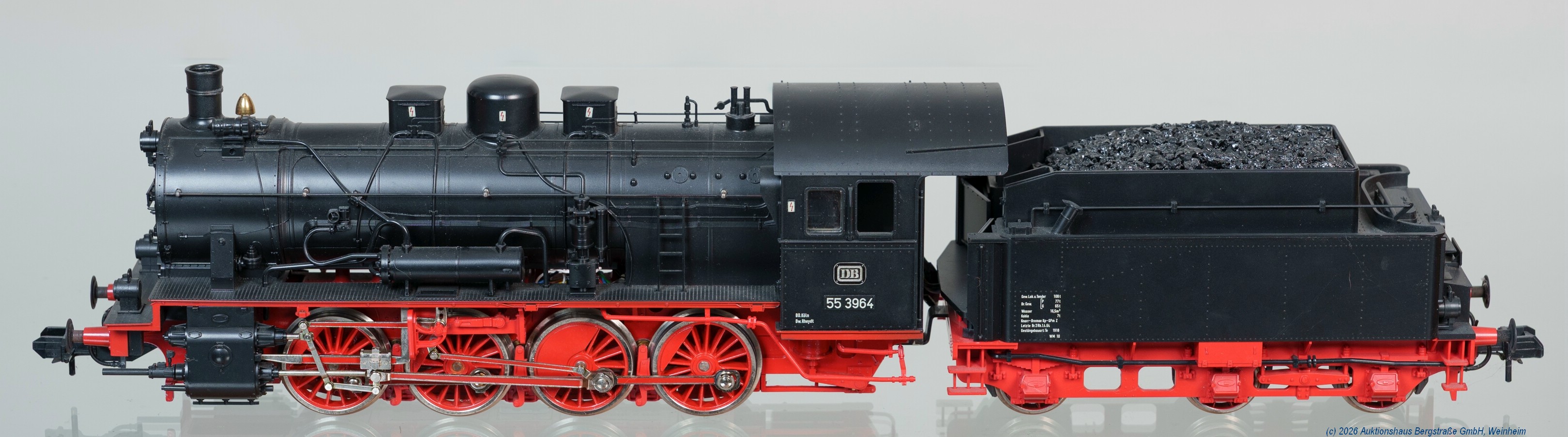 | 4015 | Tax: 920,- | 1 Schweizer Kleinserien-Dampflokomotive mit 4-achs. Tender Spur 1, schwere Metallausführung, Deutsche Reichsbahn Gesellschaft, Epoche II, Betriebsnummer: 18.434, Achsfolge: 2'C'1, messingfarbene Loklaternen, kupferne Kesselringe, Messing-Schlotkranz, Bremsschläuche, Federpuffer, Vorbildkupplungen, schwarz/rot, sehr guter Zustand, Präsentationssockel mit eingeschottertem Gleis und Plexiglashaube, nur an Selbstabholer! | |