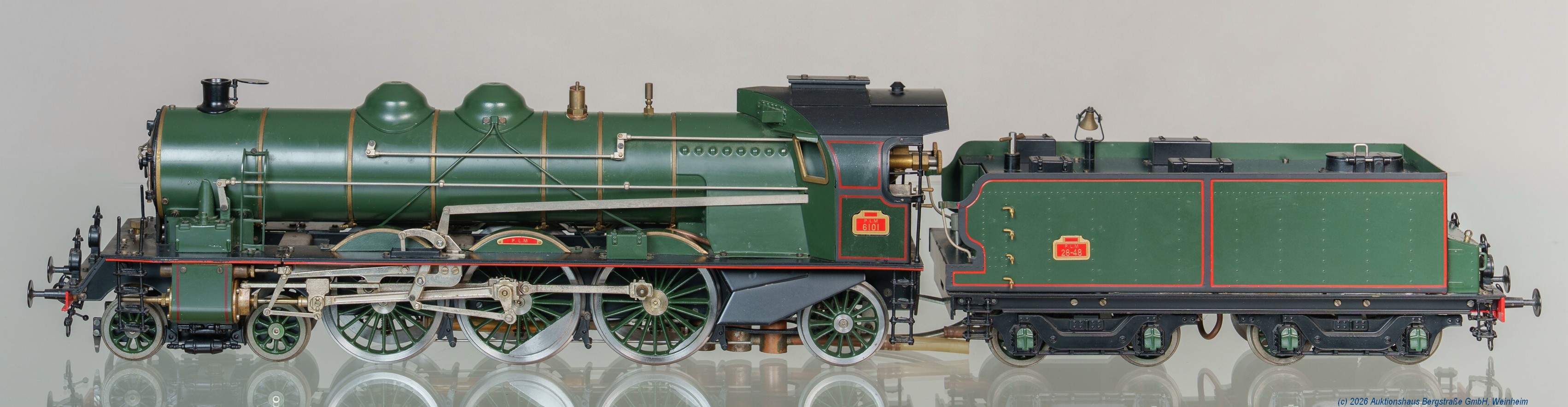 | 4016 | Tax: 1200,- | 1 Fulgurex Kleinserien Echtdampflokomotive mit 4-achs. Tender Spur 1, schwere Metallausführung, PLM, Epoche II, Betriebsnummern, Lok: 6101, Tender: 2848, Achsfolge: 2'C'1, Länge: ca. 74 cm, grün/schwarz, rote Zierlinien und Pufferbohlen, wurde nie angeheizt, guter Zustand, nur an Selbstabholer! | |