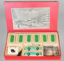 | 5012 | Tax: 180,- | 1 Eheim Trolley-Buspackung 103: 1 Bus mit Beiwagen in Kunststoffausführung, 2 x 2-achs., Gehäuse: grün/weiß (nicht verzogen), dazu 10 Masten, 12 Sockel(Guss), Fahrleitungen, Fahrregler, Steckschlüssel und Original-Anleitungsheft, alles in gutem Zustand mit unbedeutenden Gebrauchsspuren, Originalkarton(gering beschädigt mit dekorativem Deckelbild! | |